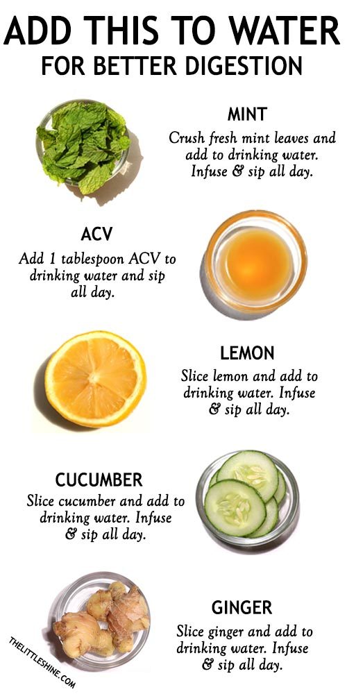 ACV has pH balancing properties and helps with better digestion. Also helps balance overall internal pH of the body and boosts metabolism. Add a tablespoon of ACV to 1 cup water and sip on it throughout the day.