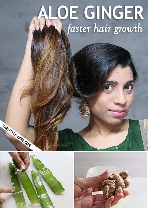 Grab a fresh aloe leaf, cut it in half and scrape out the gel using spoon. Transfer the gel in a blender and add in chopped ginger and coconut oil. Blend until nice and well-combined. Squeeze out all the juice from this mixture using a muslin cloth or a strainer. Transfer this to a spray bottle for easy application. Spray all over clean scalp and hair and massage. Keep it overnight or use a shampoo after 2 hours. Use once or twice a week.