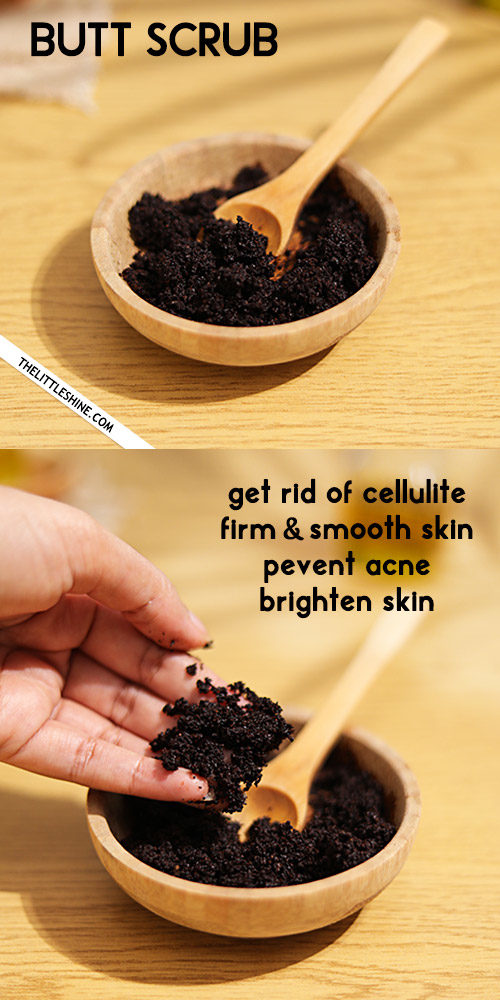 In a bowl, add ground coffee and add in enough olive oil to make a spreadable paste. Add in few drops of essential oil. Use this to massage your butt while in the shower. Follow up with your regular shower gel. READ MORE – SCALP SCRUB FOR HAIR GROWTH