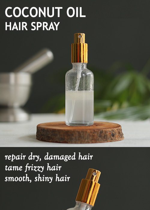 To use – Pour rose water or aloe juice or filtered water in a spray bottle, top it up with coconut oil add in few drops of essential oil of your choice. I love using peppermint or rosemary essential oil for my hair. Shake the bottle really well and spray it all over your hair after hair wash or throughout the day to keep your hair frizz-free and shiny. READ MORE – HERBAL HAIR GROWTH TONIC – faster and thicker hair growth