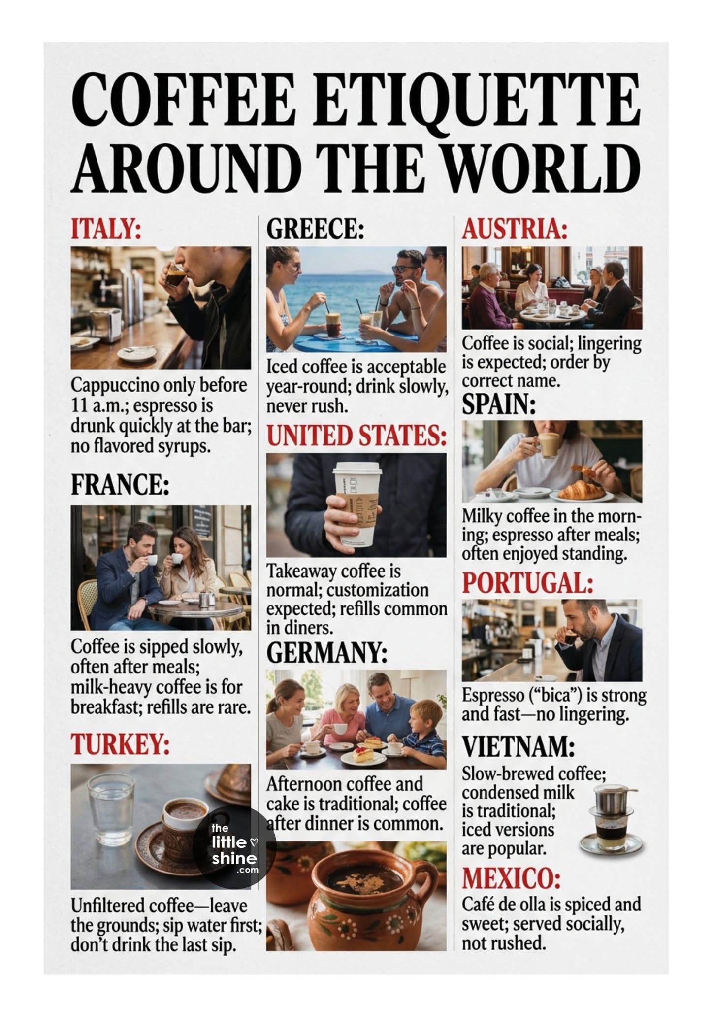 In Italy, coffee is about efficiency and tradition. Espresso is typically consumed standing at the bar, often in under a minute. Cappuccinos are considered breakfast drinks and are rarely ordered after 11 a.m. Asking for a “latte” will get you a glass of milk—locals order caffè latte instead.