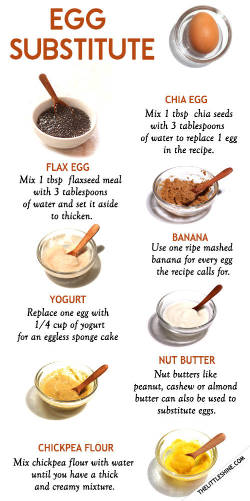 Banana – Ripe bananas are not just a good replacement for eggs, but can also partially replace sugar in your baked goods. Adding banana to baked goods can make it dense, if that’s something you like, but if you are looking for a light consistency, then this isn’t the right substitute to eggs in a recipe. To replace a whole egg in a recipe using 1 ripe banana. Mash banana well and use in place of an egg in your healthy brownie recipes. Use in your bread or muffins recipe.