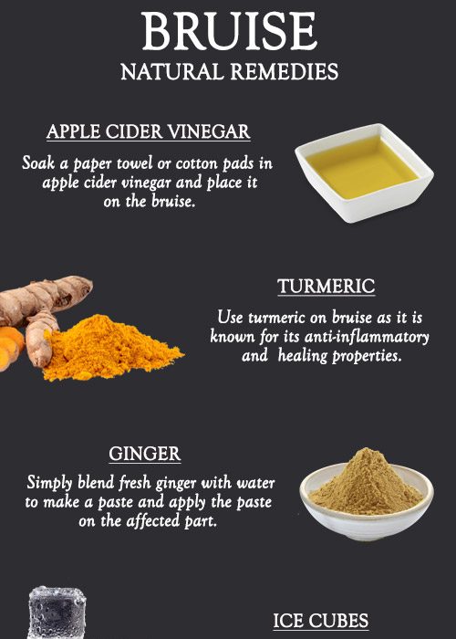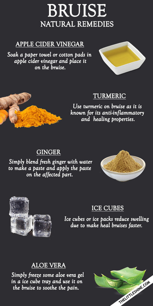 Apple cider vinegar is a great remedy for bruises. It enhances blood flow to dissolve blood clot accumulated under the skin surface due to the injury. Take some apple cider vinegar in a bowl and soak a paper towel or cotton pads in it and place it on the bruise for 15-20 minutes. Repeat it daily until the bruise is completely healed and the scar is gone.