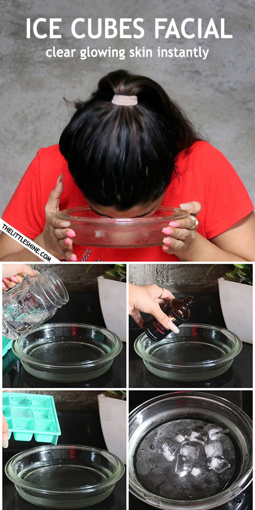 In a wide bowl or bowl that is big enough to help you dunk your face, add water. Add in rose water and ice cubes. cleanse your face and dunk in this ice cube water for a few seconds. Do this 6-7 times and pat dry. Do this everyday in the morning.