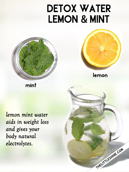 Lemon and Mint Water – This detox water helps to o relieve symptoms of indigestion and heartburn by soothing the muscles in and around the intestine. When mint is combined with lemon it helps to flush out toxins and aids in weight loss.