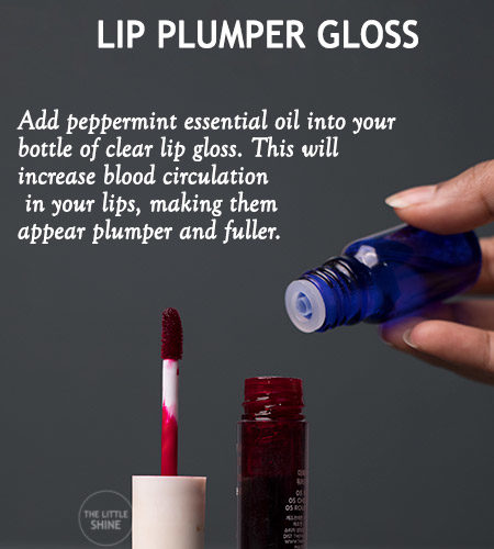 Pour 2-3 drops of peppermint oil into the bottle of clear lip gloss. Put the cap back on and shake it well to evenly distribute the oil. Apply to your lips to make your lips plump and fuller.