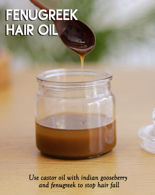 To make – Take a saucepan and add some water to it. Place a big bowl on top of it to create a double boiler. Add 1/2 cup of any hair oil of your choice – castor oil, black seed oil, sesame oil, or even coconut oil to the bowl. Add 1 tbsp of amla ( Indian gooseberry to the oil ) and 1 tbsp of fenugreek powder to it. Warm the oil on low flame for 15-20 mins. If you don’t want to use the double boiler method then simply add the oil along with the powders to a jar and place it in some warm place for 2-3 weeks to infuse.
