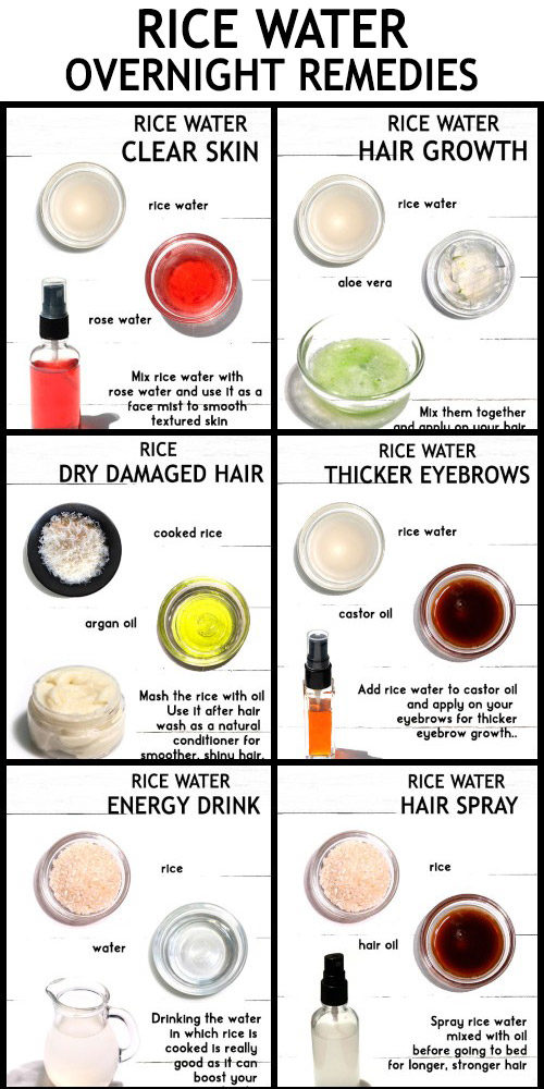 Eyebrow growth – Rice water works amazingly well to boost eyebrows. For an amazing eyebrow growth serum, mix rice water along with black castor oil and add it to a clean mascara bottle. Shake it really well to mix it together each them u use it and apply it on your eyebrows.