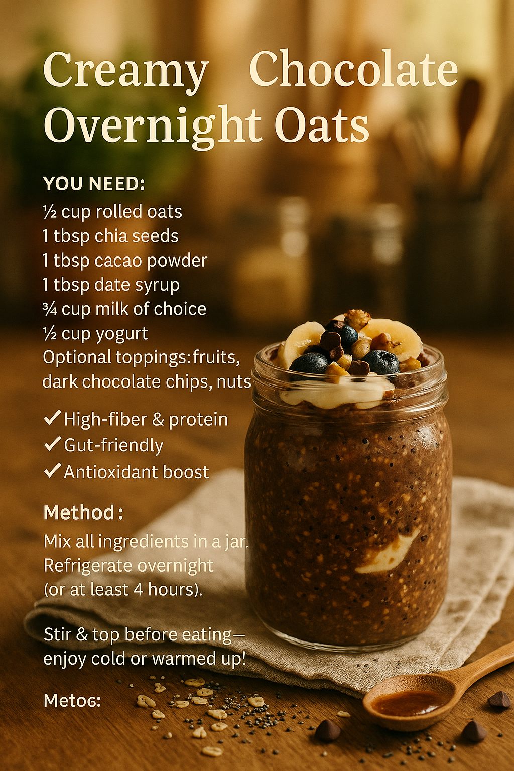 - How to make it: In a jar, combine ½ cup rolled oats, 1 tbsp chia seeds, ¾ cup milk, 1 scoop chocolate protein powder or 1 tbsp cacao powder, date syrup and 1/2 cup yogurt. Shake or stir well. Refrigerate overnight. In the morning, top with sliced banana or a spoonful of almond butter.
