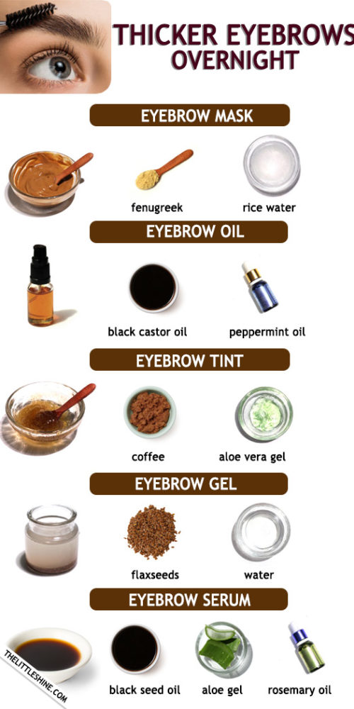 Eyebrow Oil – Make an eyebrow oil to regrow overplucked eyebrows overnight. Black castor oil helps to thicken your eyebrows while rosemary oil makes your eyebrows grow faster. Mix 2 tbsp of black castor oil with 2-4 drops of peppermint essential oil. Mix it all up and pour it into a jar. Take a small amount on your ring finger and massage the oil on your eyebrows for few mins before going to bed.