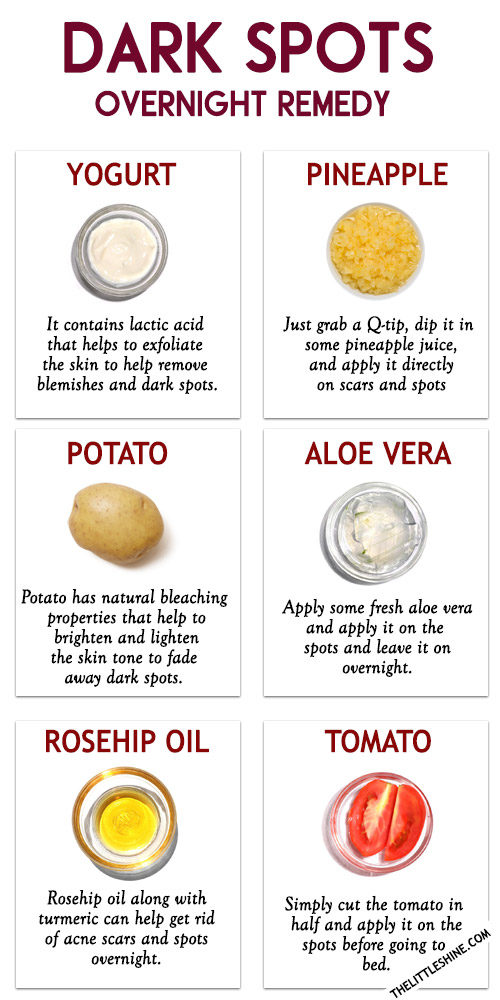 Potato for dark spots – Potato has natural bleaching properties that help to brighten and lighten the skin tone to fade away dark spots. Grate some fresh and clean potatoes and add them to a cheesecloth. Squeeze out all the juice from the grated potatoes to collect the juice in a bowl. Apply the freshly squeezed juice on your dark spots and leave it on overnight to fade the spots and acne scars.