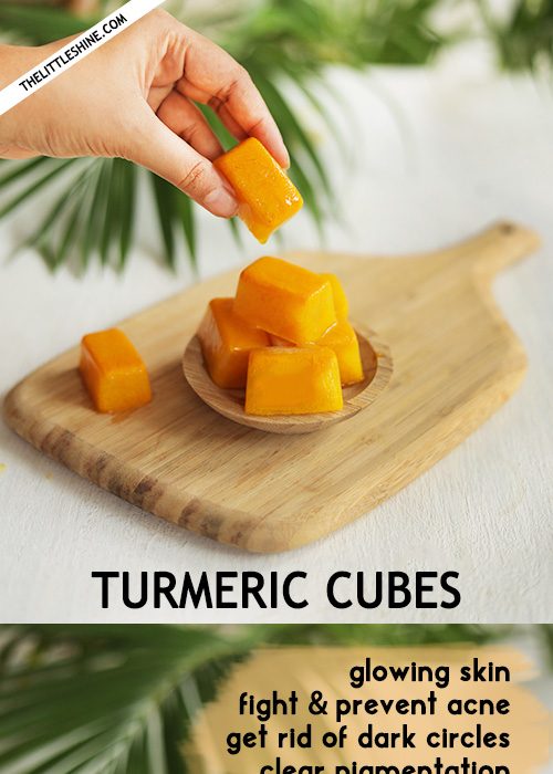 To make turmeric cubes, take fresh aloe Vera gel From the plant and blend it to a smooth consistency. Mix turmeric powder to it and mix everything well until well combined and put it in an ice cube tray. Freeze it overnight.