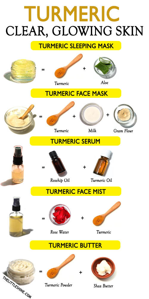 In a spray bottle, add 1/2 cup rose water and pinch turmeric. Shake well and use it as a facial mist all day.