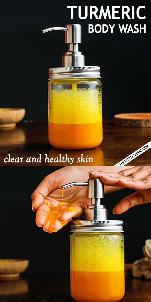 In a bowl, add filtered water along with liquid castile soap. If you do not have castile soap, use a baby wash or a mild herbal body wash instead. Add in lemon essential oil or any other essential oil of your choice and organic turmeric powder. Pour the body wash in a pump bottle and use it every day. If you have extremely dry skin then use 1 Tbsp of coconut oil or 1/4 cup aloe vera gel. READ MORE – TURMERIC NIGHT SKIN GEL – WAKEUP TO CLEAR, HEALTHY AND GLOWING SKIN