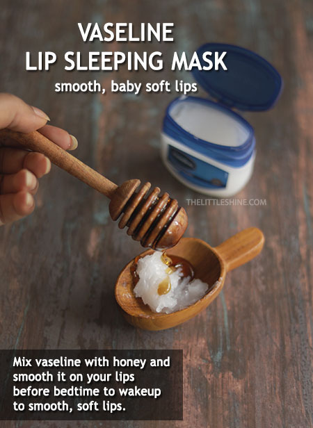 The problem of chapped lips or cracked lips is very common especially to people living in cold countries or in cities having dry weather. The skin on the lips becomes dry and can start to peel off. So, if you do not have a lip balm, using Vaseline as the lip balm can help do the trick. Mix vaseline with equal amounts of raw honea nd apply a thin layer of on your lips and gently massage it in before going to bed.