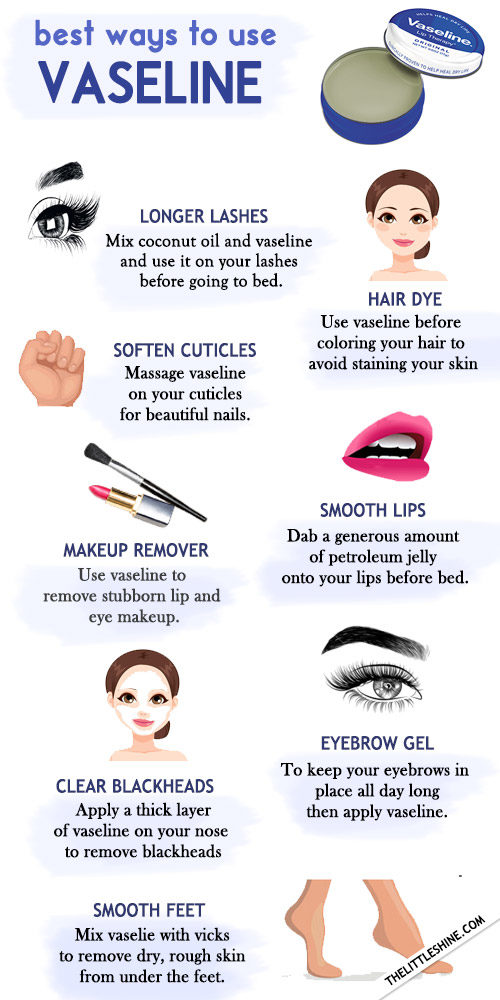 Makeup remover – If you have water poof mascara or lipstick that is difficult to remove then simply use a small amount of vaseline and then wipe it off with warm water to take it off easily.