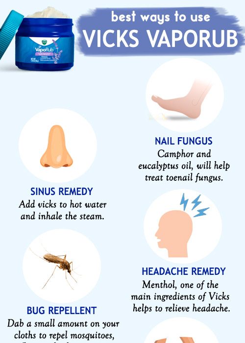 Bug bite – Rub a small amount of Vicks on a bug bite to soothe the itch and swelling. The camphor oil in Vicks can help relieve pain, irritation, and itching. READ MORE – MOSQUITO REPELLENT NATURAL REMEDIES
